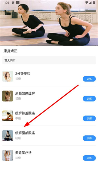 2、進入康復矯正頁面后,在訓練項目列表里,點擊緩解腰部酸痛右側(cè)的訓練按鈕。