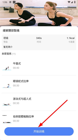 3、進入緩解腰部酸痛訓練詳情頁,確認訓練信息后,點擊下方的開始訓練按鈕。