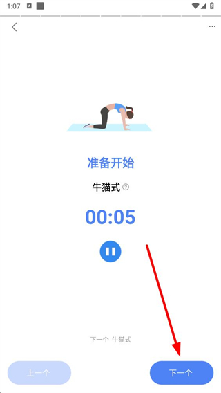 4、進入訓練界面,根據(jù)提示進行動作練習,完成當前動作后,點擊下一個按鈕,繼續(xù)后續(xù)訓練動作,直至完成整套訓練。