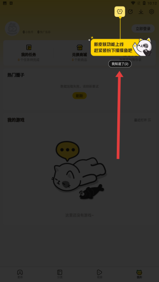 2、進(jìn)入摸摸魚主界面,會(huì)彈出新功能提示框,點(diǎn)擊我知道了按鈕關(guān)閉提示,查看我的游戲、熱門圈子等板塊內(nèi)容。
