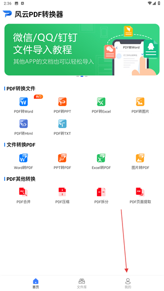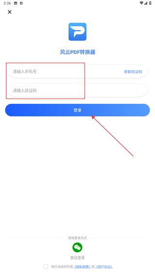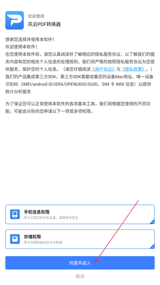 1、打開風云PDF轉換器APP,進入時會彈出用戶協(xié)議和隱私政策,點擊同意并進入的按鈕。