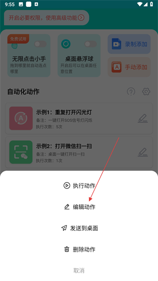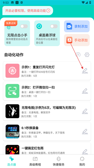 1、打開Tap連點器,在連點器頁面找到自動化動作板塊,點擊示例動作右側(cè)的編輯圖標。