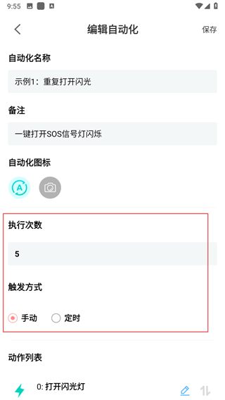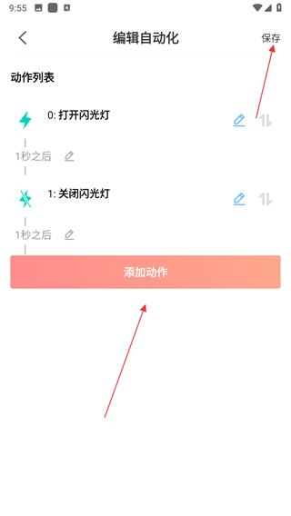 4、向下滑動可查看已有的動作,點擊添加動作能新增步驟,設(shè)置完成后點擊右上角保存。