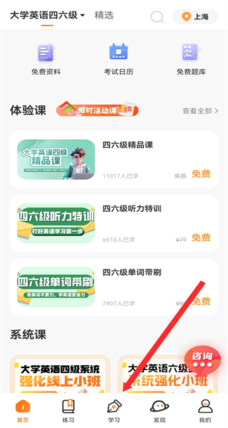1、在高頓網(wǎng)校的首頁,需要點(diǎn)擊底部學(xué)習(xí),進(jìn)入學(xué)習(xí)頁面按鈕。