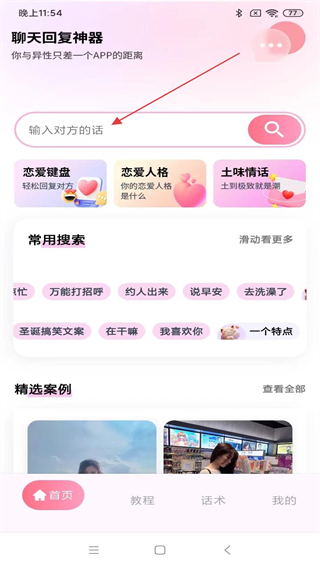 一款50萬(wàn)+的智能話(huà)術(shù)庫(kù)神器,一鍵搜索回復(fù)妹子說(shuō)的話(huà),你的聊天小助手,智能分辨聊天話(huà)術(shù),語(yǔ)義搜索答案,自動(dòng)回復(fù)說(shuō)不出口的甜言蜜語(yǔ),幫助男生解決尬聊問(wèn)題,情話(huà)綿綿,盡情吧