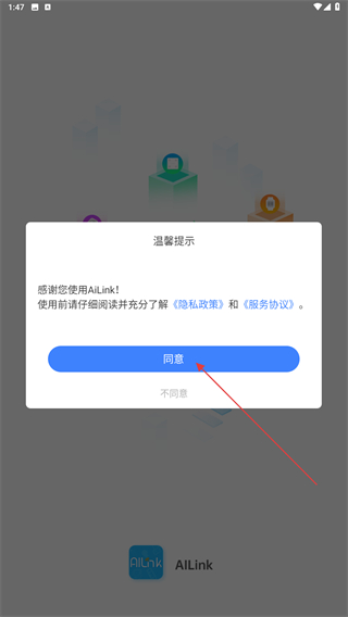 1、打開ailinkAPP,進(jìn)入時會彈出溫馨提示,閱讀后點(diǎn)擊同意的按鈕。