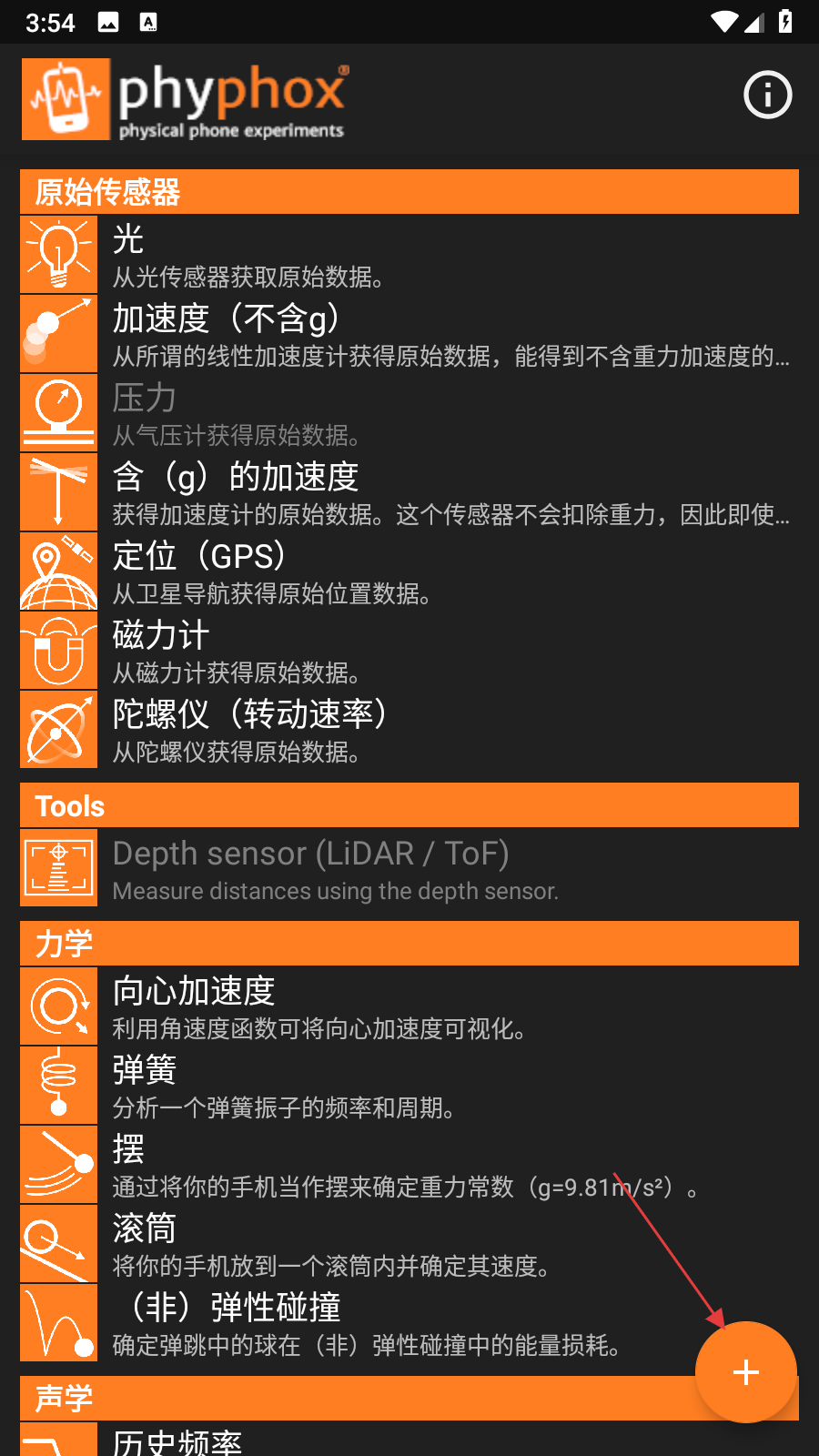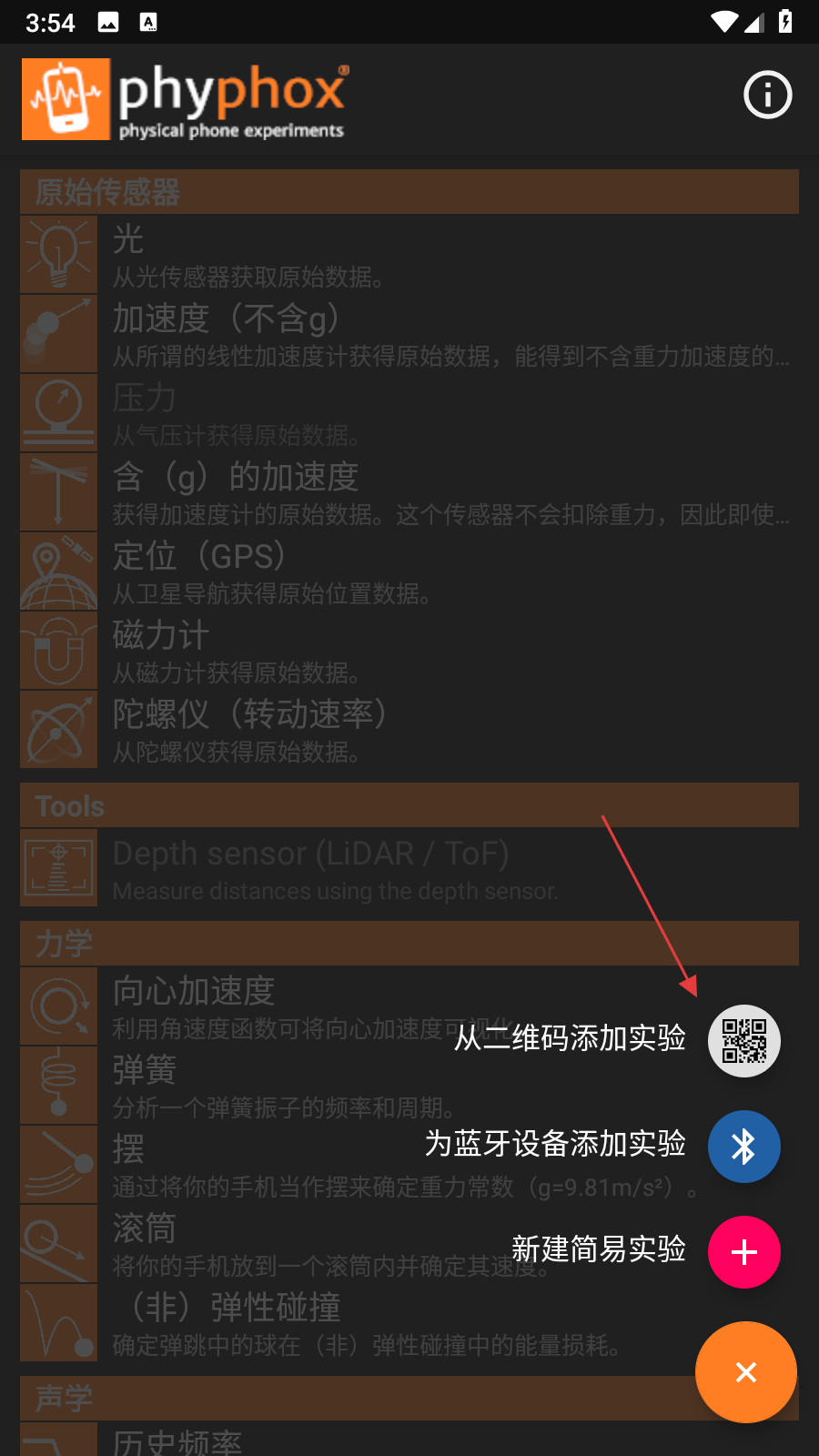 1、打開Phyphox應(yīng)用,在主界面找到右下角橙色+按鈕,點(diǎn)擊該按鈕,彈出包含從二維碼添加實驗,為藍(lán)牙設(shè)備添加實驗,新建簡易實驗的選項列表。