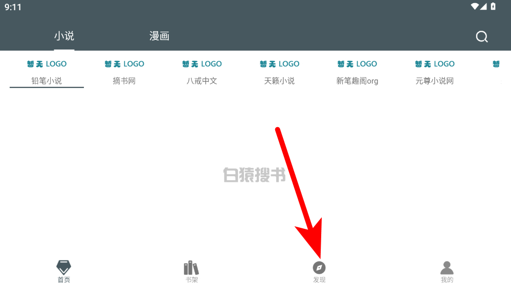 1、在搜書(shū)應(yīng)用首頁(yè),點(diǎn)擊底部發(fā)現(xiàn)選項(xiàng),進(jìn)入發(fā)現(xiàn)頁(yè)面。