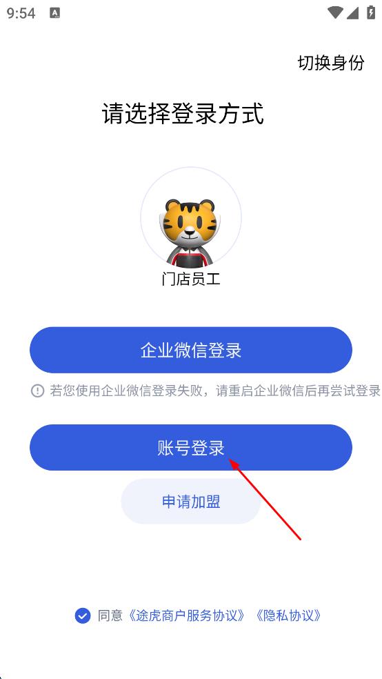 1、打開途虎商戶版軟件,進入登錄方式選擇頁面后,點擊“賬號登錄”選項,進入賬戶密碼登錄界面。