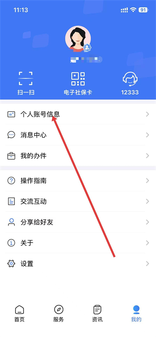 1、打開(kāi)掌上12333,點(diǎn)擊底部導(dǎo)航欄最右側(cè)我的選項(xiàng)。