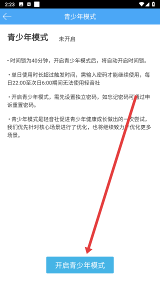 2、在進(jìn)入到青少年模式頁面后,可以點(diǎn)擊下方開啟青少年模式按鈕進(jìn)行操作。
