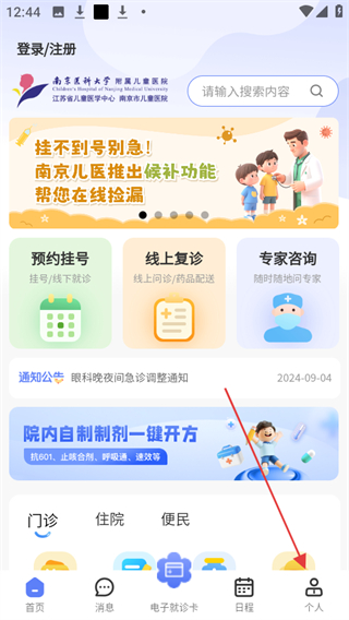 1、打開南京兒醫(yī)在線app,點擊底部導航欄中的個人選項。