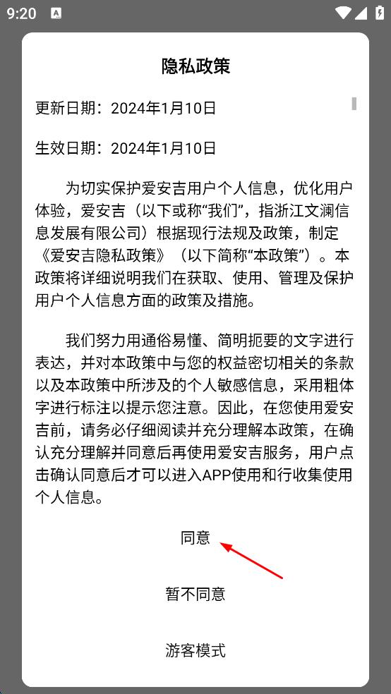1、打開(kāi)愛(ài)安吉APP,進(jìn)入后會(huì)出現(xiàn)隱私政策頁(yè)面,仔細(xì)查看后點(diǎn)擊“同意”按鈕。