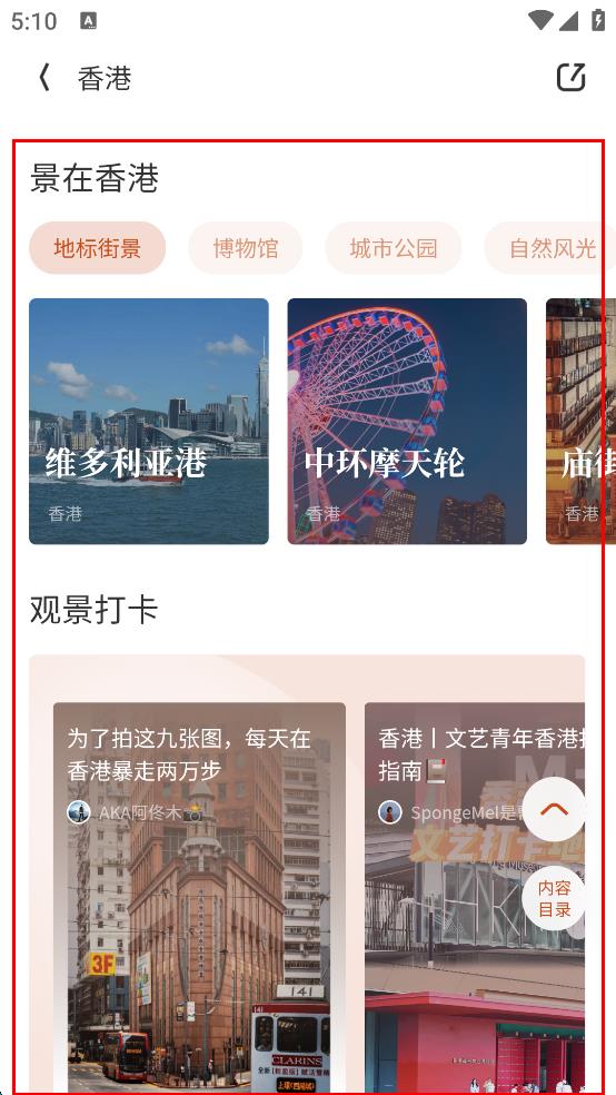 4、在香港相關頁面,即可查看“景在香港”板塊下的維多利亞港、中環(huán)摩天輪等景點,以及“觀景打卡”板塊下的相關內容。