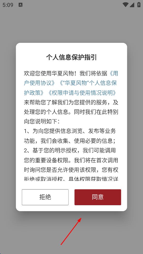 1、打開華夏風物軟件,彈出個人信息保護指引彈窗,仔細閱讀后點擊“同意”按鈕,進入軟件主界面。
