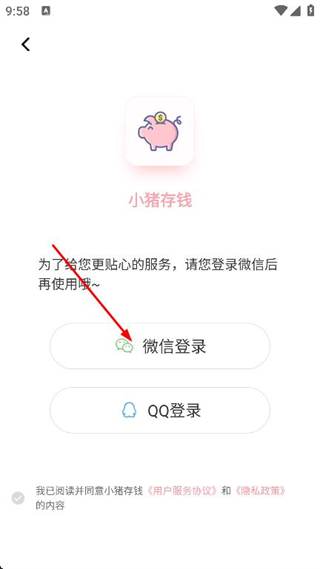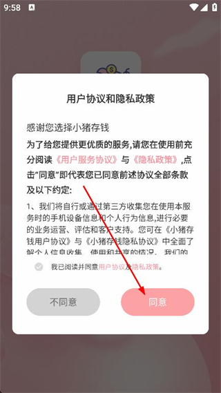 1、打開(kāi)小豬存錢(qián),在彈出的隱私政策界面點(diǎn)擊同意。