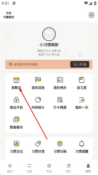 2、在我的頁(yè)面,找到并點(diǎn)擊倒數(shù)日?qǐng)D標(biāo)。