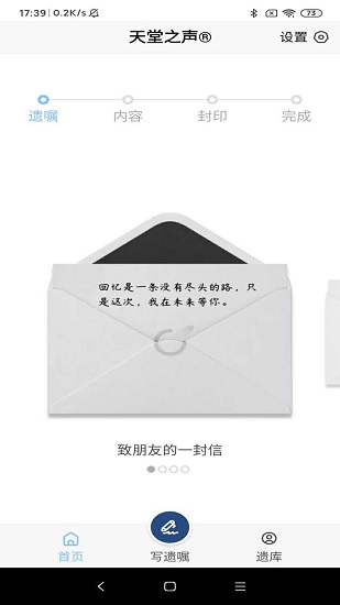 天堂之聲是一款專業(yè)的電子遺囑軟件,用戶可以在軟件中隨時(shí)保存自己的遺囑信息,軟件內(nèi)不僅提供文字的形式,還可以選擇視頻、聲音、圖片等多種方式來設(shè)立自己的遺囑,還可以設(shè)立選擇接收的人,軟件內(nèi)來提供律師等專業(yè)服務(wù)進(jìn)行公正,有需要的朋友就快來下載吧!