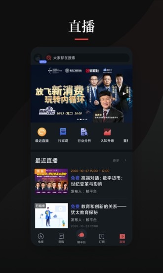 鯨平臺app給用戶帶來豐富的自選,豐富的新聞資訊內(nèi)容給用戶全平臺的服務(wù)體驗,特色的直播,可視化的搜索操作,以及相關(guān)的財經(jīng)分析講解讓你更好的了解,有需要的用戶就來下載試試吧!