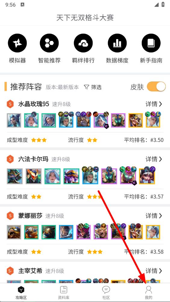 1、首先大家通過本站點擊下載軟件后,進入軟件可以看見首頁給大家提供了攻略區(qū)/資料庫/社區(qū)/我的四個欄目,在攻略區(qū)欄目中,有模擬器/智能推薦/羈絆排行/數(shù)據(jù)梯度和新手指南等給大家參考;