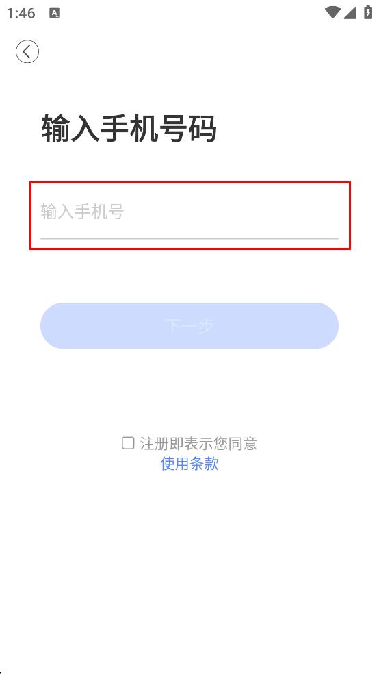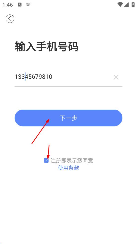 4、填寫好手機(jī)號(hào)碼后,勾選“注冊(cè)即表示您同意使用條款”選項(xiàng),然后點(diǎn)擊“下一步”按鈕,繼續(xù)后續(xù)的注冊(cè)步驟。