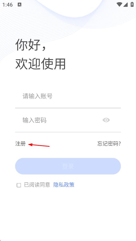 2、進(jìn)入登錄界面后,看到有“請(qǐng)輸入賬號(hào)”“輸入密碼”等選項(xiàng),若沒有賬號(hào),點(diǎn)擊“注冊(cè)”選項(xiàng),進(jìn)入注冊(cè)流程。