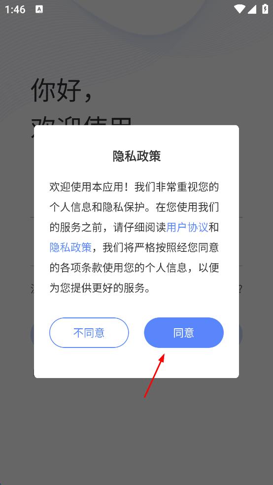 1、打開應(yīng)用,會(huì)彈出隱私政策提示框,提示閱讀用戶協(xié)議和隱私政策,仔細(xì)閱讀后,若同意,點(diǎn)擊“同意”按鈕。