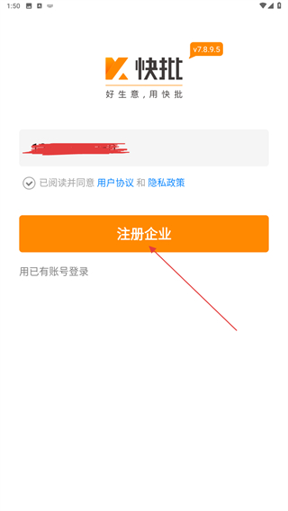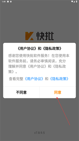 1、打開快批APP,進入時會彈出用戶協(xié)議和隱私政策,點擊同意的按鈕。