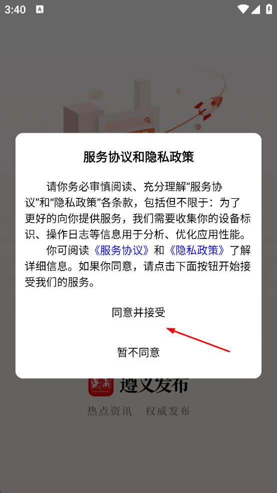 1、打開(kāi)遵義發(fā)布,在彈出的服務(wù)協(xié)議和隱私政策頁(yè)面,點(diǎn)擊同意并接受,進(jìn)入遵義發(fā)布首頁(yè)。