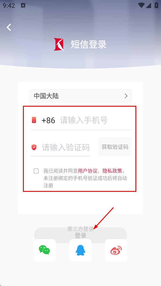 4、在短信登錄頁面,輸入手機號和驗證碼,勾選“我已閱讀并同意用戶協(xié)議、隱私政策”,點擊“登錄”按鈕完成登錄。