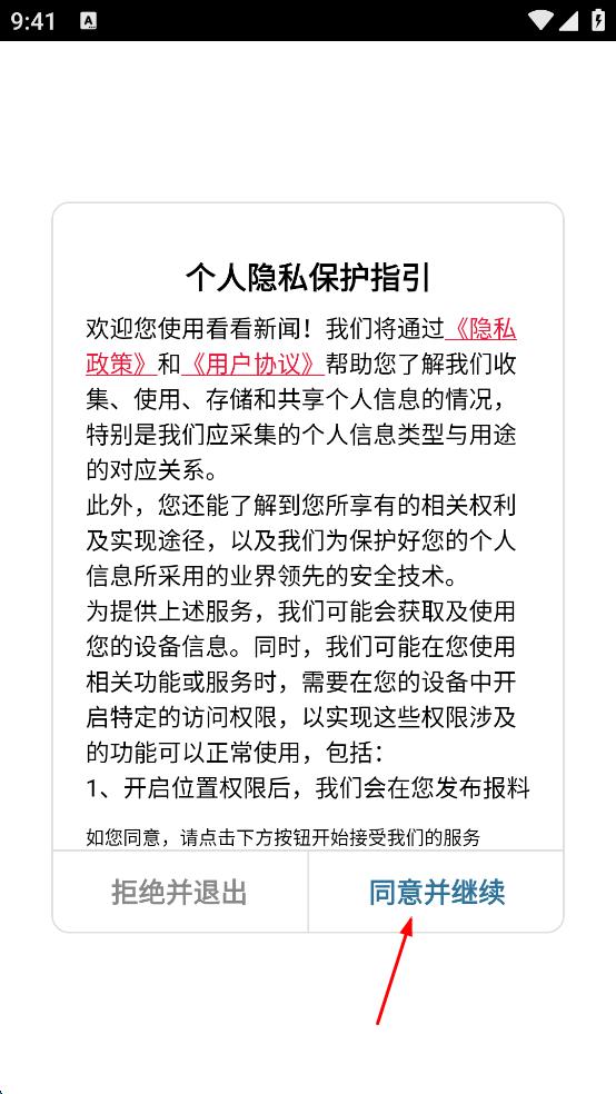 1、打開看看新聞APP,進入個人隱私保護指引頁面,閱讀相關(guān)內(nèi)容后,點擊“同意并繼續(xù)”按鈕,進入APP主界面。
