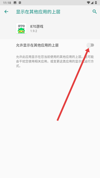 4、在進(jìn)入到設(shè)置界面中,點(diǎn)擊開(kāi)關(guān)按鈕,同意允許顯示在其他應(yīng)用的上層。