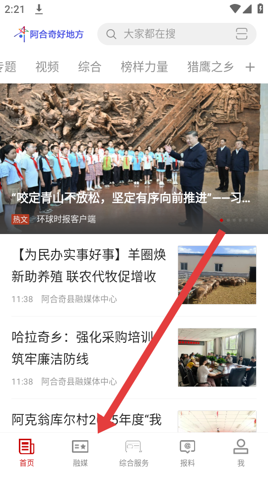1、打開(kāi)阿合奇好地方app,在首頁(yè)底部導(dǎo)航欄中,點(diǎn)擊融媒按鈕,進(jìn)入融媒相關(guān)界面,這是收聽(tīng)廣播的起始步驟。