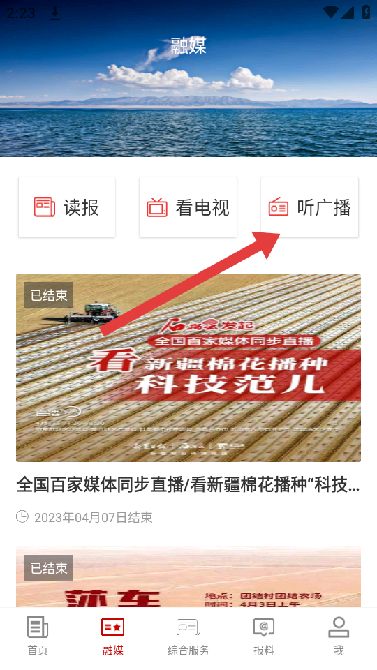 2、進(jìn)入融媒的界面后,在上方功能區(qū)域找到并點(diǎn)擊聽(tīng)廣播選項(xiàng),從而進(jìn)入廣播頻率的選擇頁(yè)面。