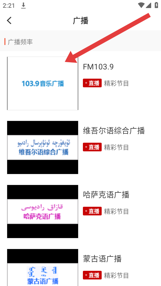 3、在廣播頻率選擇頁(yè)面,瀏覽各類(lèi)廣播選項(xiàng),如FM103.9音樂(lè)廣播,點(diǎn)擊想要收聽(tīng)的廣播,即可開(kāi)始收聽(tīng)對(duì)應(yīng)的直播節(jié)目。