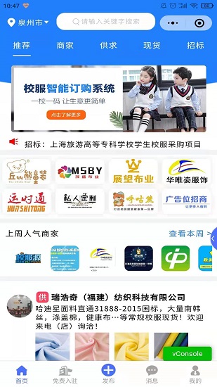 5、校服源供應(yīng)鏈平臺(tái)已有多家園服 、校服、加工廠(chǎng)、輔料商行、產(chǎn)品檢測(cè)機(jī)構(gòu)、物流等商家入駐。