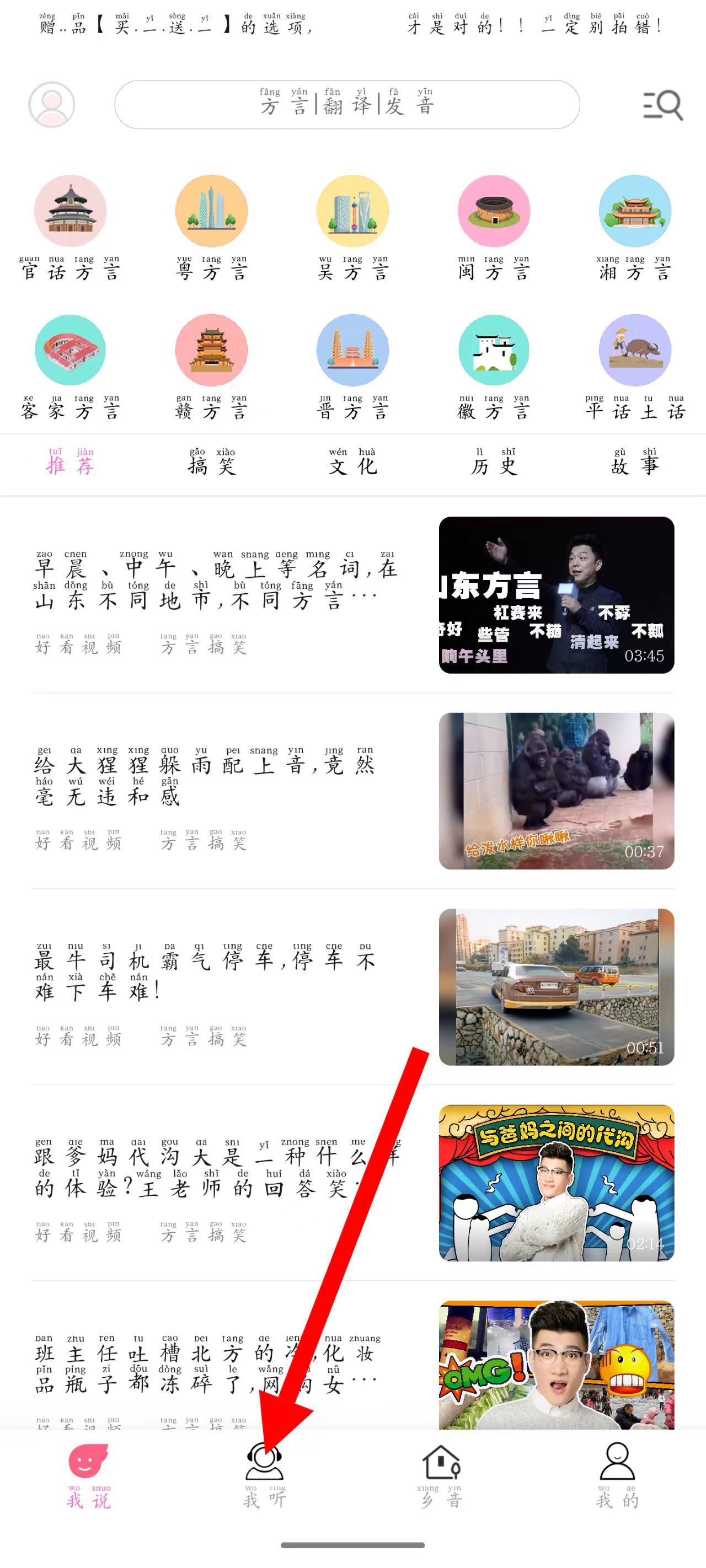 1、打開方言類App,點擊底部導(dǎo)航欄的我聽進入對應(yīng)界面。