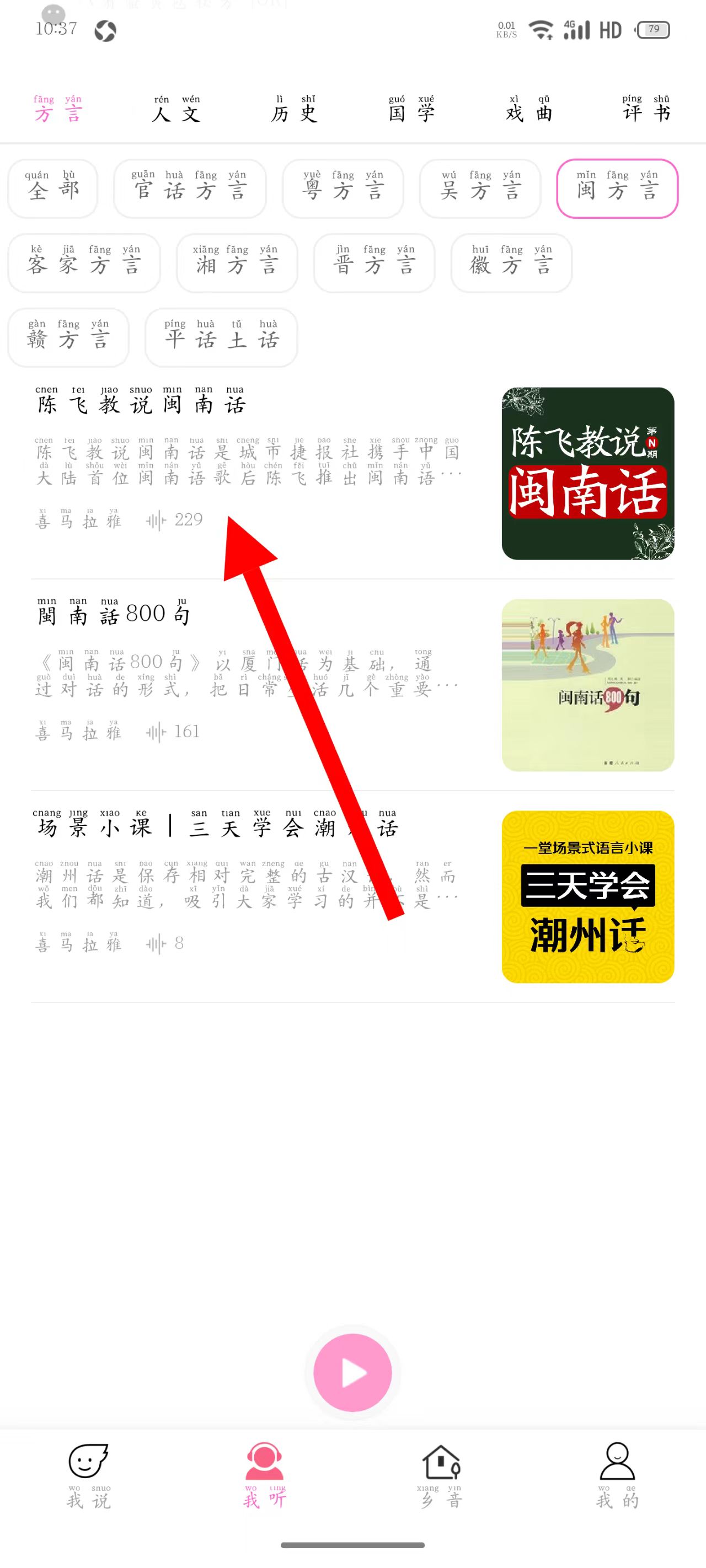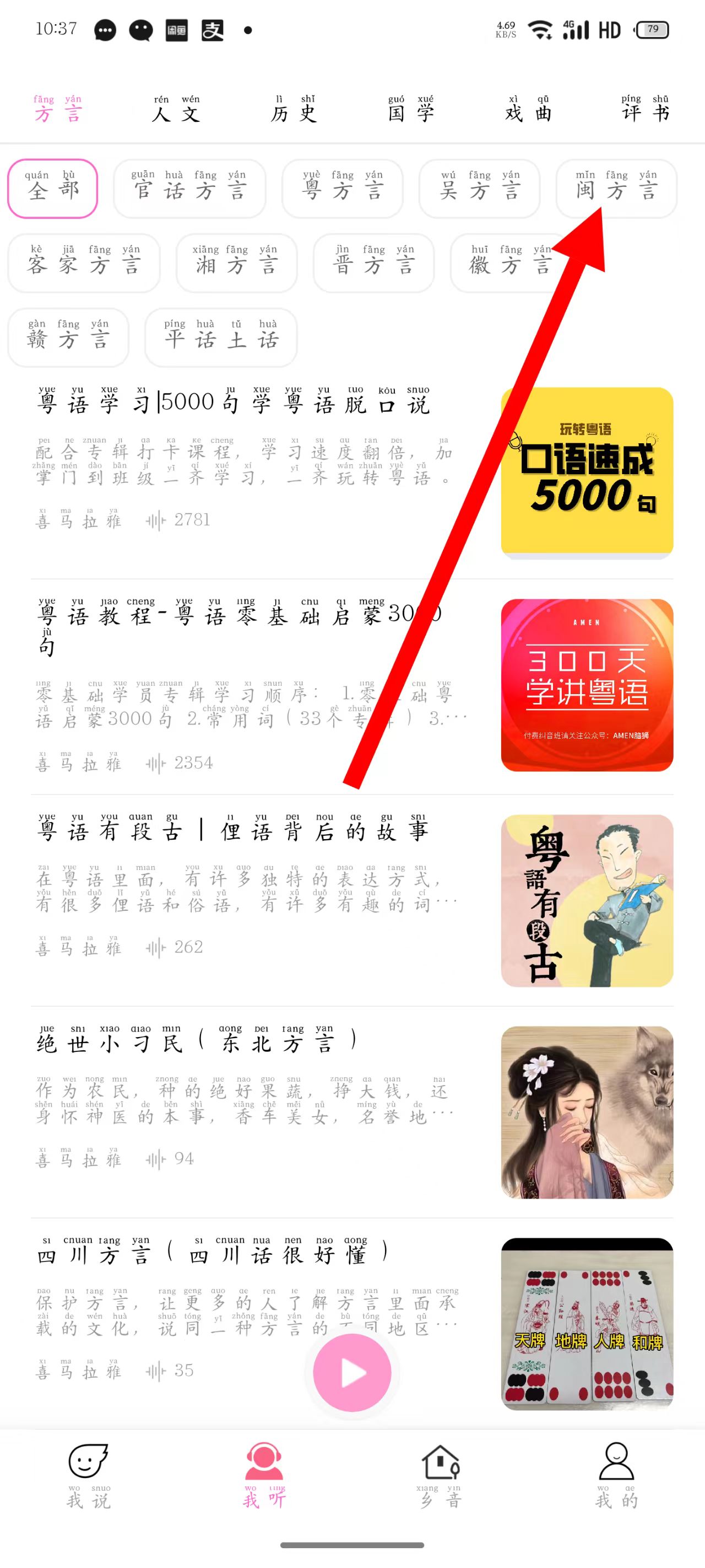 2、在我聽界面,找到并點擊閩方言選項,進入閩方言相關(guān)內(nèi)容頁面。