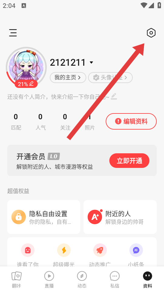 2、在個(gè)人資料頁(yè)面的右上角,點(diǎn)擊六邊形的設(shè)置圖標(biāo),進(jìn)入設(shè)置的界面。