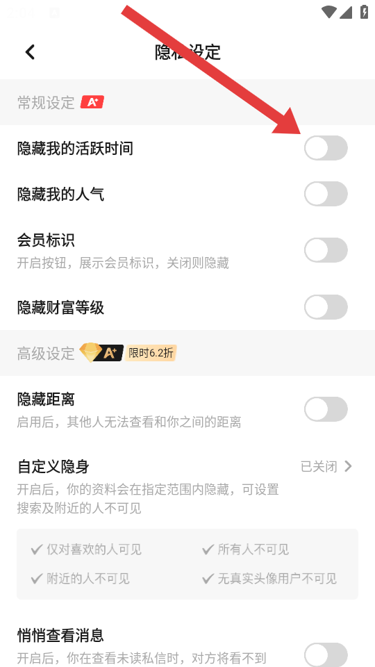 4、在隱私設(shè)定頁(yè)面的常規(guī)設(shè)定區(qū)域,找到隱藏我的活躍時(shí)間選項(xiàng),點(diǎn)擊開(kāi)啟隱藏活躍時(shí)間。