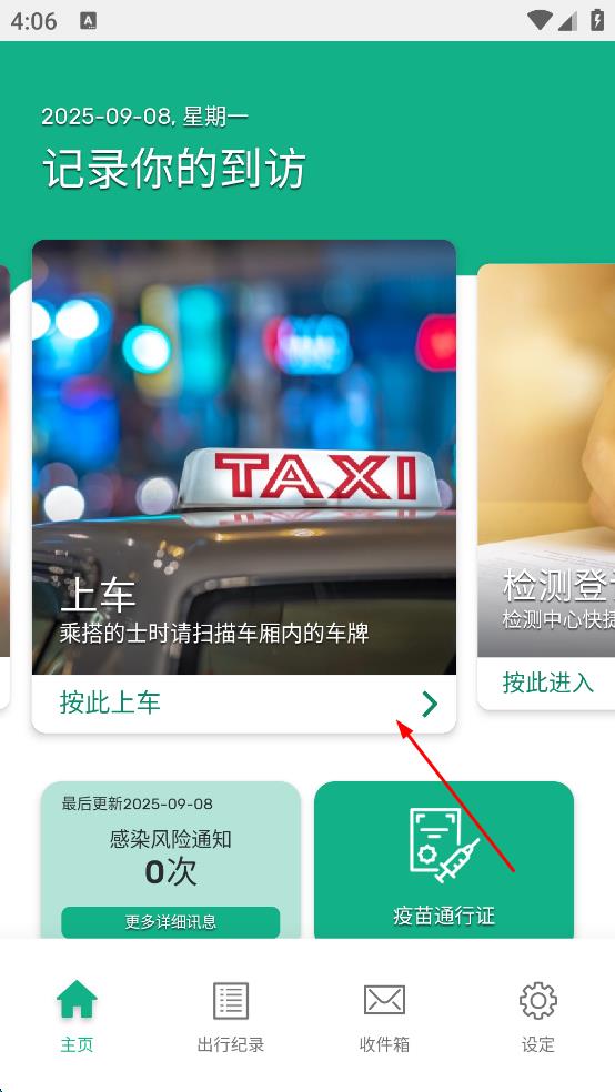 2、在主界面,找到“記錄你的到訪”板塊中的“上車”選項(xiàng),點(diǎn)擊“按此上車”,進(jìn)入的士車牌相關(guān)頁面。