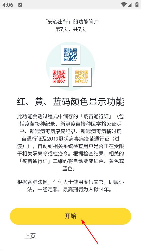 1、打開安心出行APP,在功能簡介最后一頁,點(diǎn)擊“開始”按鈕,進(jìn)入APP主界面,準(zhǔn)備進(jìn)行到訪記錄操作。