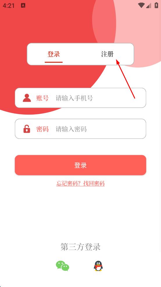 3、在登錄注冊界面,點擊“注冊”選項,切換到注冊頁面。