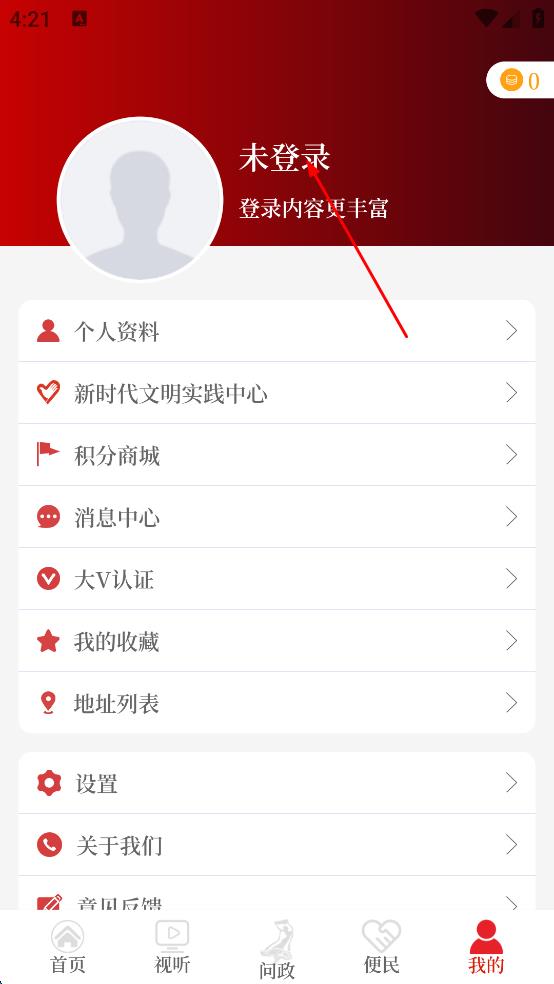 2、在個人中心頁面,點擊“未登錄”字樣,進入登錄注冊界面。