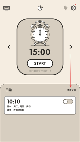 1、打開專注鬧鐘應(yīng)用,在主界面點擊日常板塊右側(cè)的查看全部,進入我的日常頁面。