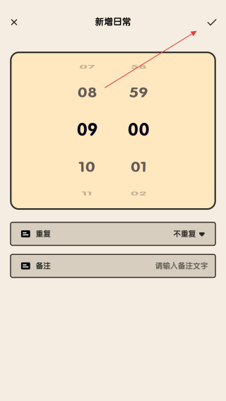3、在新增日常界面,設(shè)置好鬧鐘時間,然后點擊右上角的對勾圖標(biāo),確認新增日常鬧鐘。