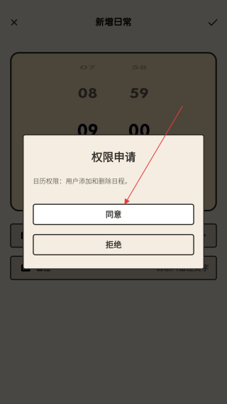 4、彈出權(quán)限申請窗口,點擊同意按鈕,即可完成日常鬧鐘的創(chuàng)建。