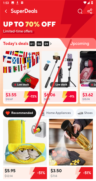 1、在進(jìn)入到App首頁中,可以下拉找到喜歡的商品,點(diǎn)擊進(jìn)入購買。