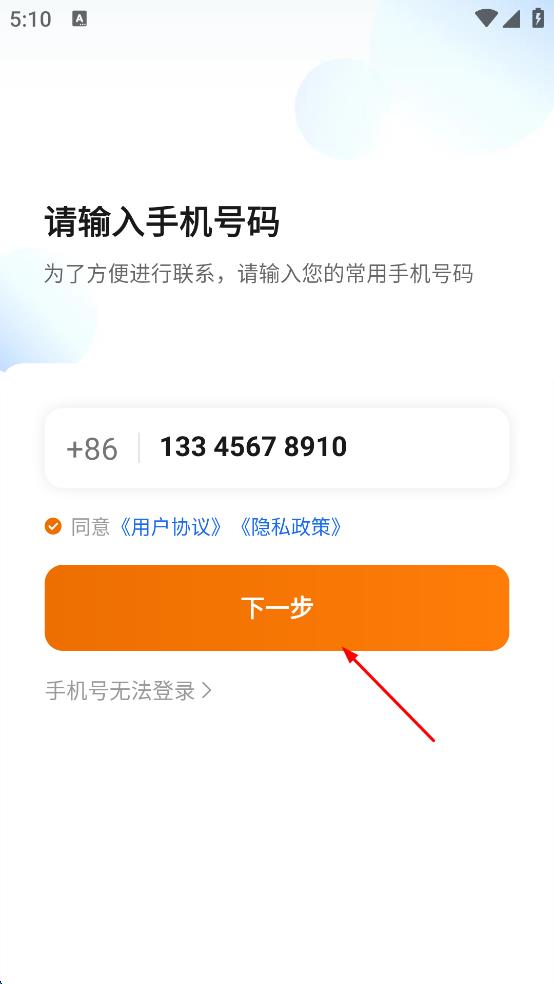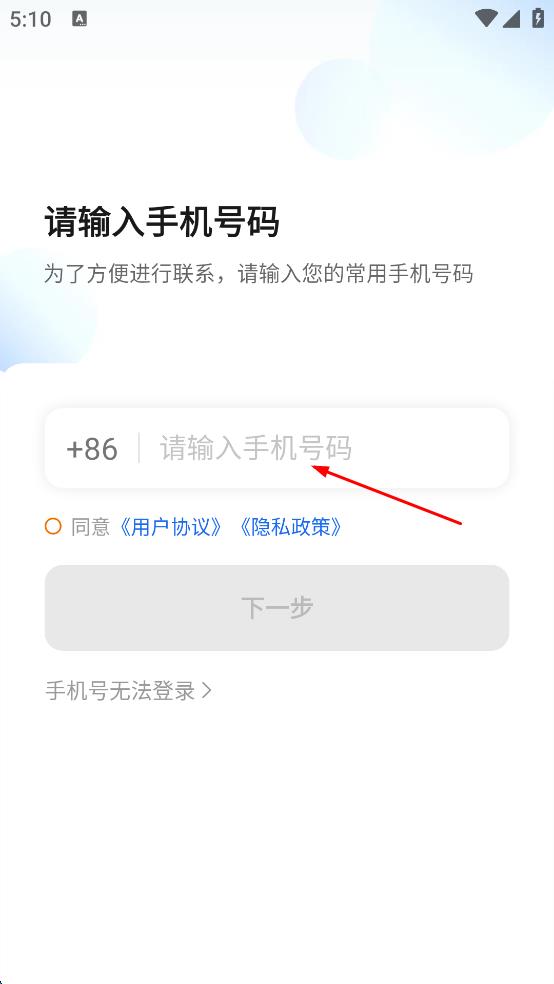 2、進(jìn)入請(qǐng)輸入手機(jī)號(hào)碼頁(yè)面,在輸入框輸入常用手機(jī)號(hào)碼。
