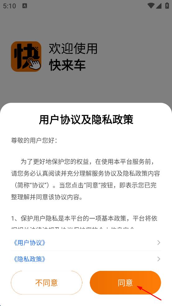 1、打開快來(lái)車,出現(xiàn)用戶協(xié)議及隱私政策提示框,點(diǎn)擊同意。